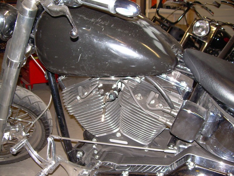 Dazu wurde ein kompletter Kabelbaum einer Vergaser Softail eingezogen, die Zündung ersetzt und statt der Delphi EFI verrichtet nun ein Mikuni HRS42 seinen Dienst am Bike. Weiter wurde ein Vergasertank umgebaut um einen schönen neuen kleinen Tacho aufzunehmen.