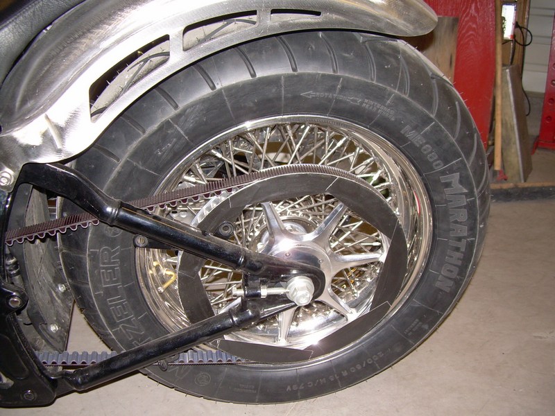 Der Belt wurde gegen einen 20mm Riemen der 2006er Modelle getauscht und mit einem Ricks Beldtrad kombiniert. So konnte das Hinterrad jetzt mittig ausdistanziert werden.