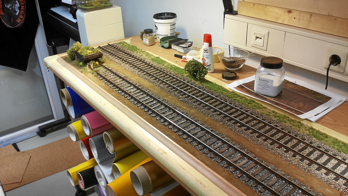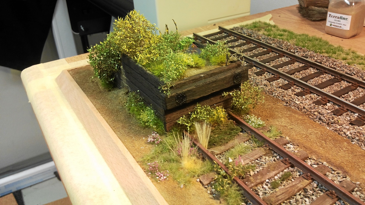 Nach den Schotterarbeiten wurde begonnen, das Diorama mit Grün zu bestücken. Auf die Korkplatten kam erst etwas Sand und dann wurden einzelne Grassbüschel verklebt. Im hinteren Teil wurde eine Grasmatte verwendet. Das geht zwar viel schneller, sieht aber nicht so realistisch aus.
