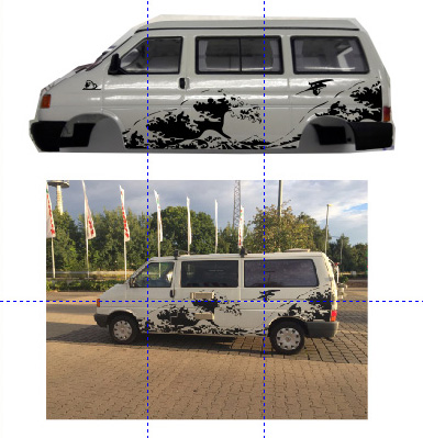Diese Vorlage wurde massstäblich ins Corel importiert, dann wurde das Original Foto in schwarzweiß umgewandelt und die Folierung vektorisiert. Das frei skalierbare Ergebnis konnte anschließend über das Foto des Modells gelegt und angepasst werden. Denn der Camper war ja nur die kurze Version.