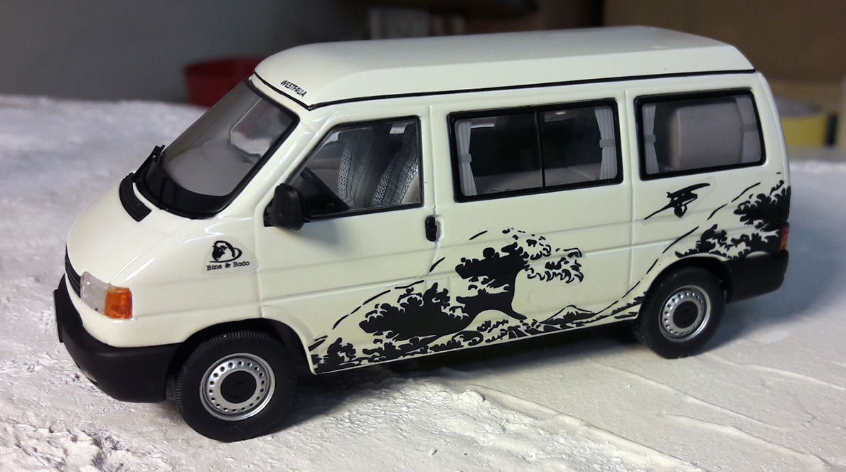 Das fertige Motiv wurde dann auf Nassschiebfolie ausgedruckt und auf dem Bus platziert.