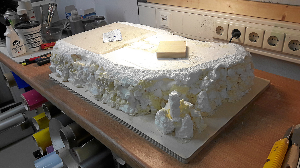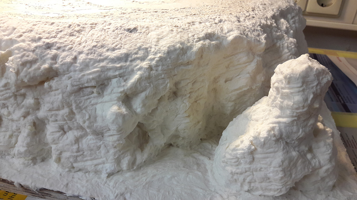 Die Multiplex Sperrholzplatte als Grundplatte bekam ich von einem Bekannten, für den Felsen fand ich im Keller ein Styroporteil einer Flachbildschirmverpackung. Diese fand ich recht passend und so waltete das Cuttermesser, um dem Teil ein wenig Form zu geben. Dann kam ein Schritt, der mich einen Pulli kostete....Bauschaum...was für ein Höllenzeug, aber klebt auch wie Hölle ;-)