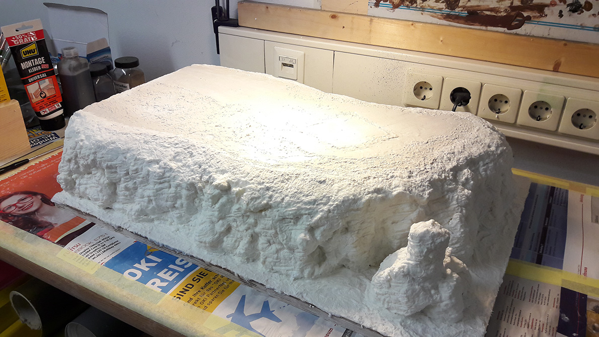 Das Plateau wurde mit Moltofill verspachtelt und gleich etwas modelliert, danach ging es an die erste Farbgebung....