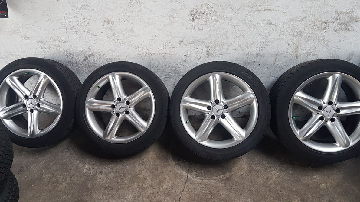 Mit den Reifen war ich seit Kauf nicht zufrieden. Trotz mehrmaligem Auswuchten war immer eine leichte Unwucht im Bereich um 120 km/h zu spüren. Die Reifen waren zwar erst 4 Jahre alt, aber die Unwucht war nicht zu beheben. Es war also klar, dass zur neuen Saison auch neue Reifen fällig werden. Allerdings spekulierte ich auch auf ein paar AMG 18" Alus, da ich gerne den Original Look wollte. Dieser Wunsch stellte sich aber schnell als Wunschtraum heraus, denn solche Felgen sind in einem guten Zustand kaum oder nur zu entsprechenden Preisen zu bekommen.