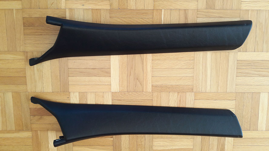 Auf der Beifahrerseite hat der sich der Kunstlederbezug der A-Säulenverkleidung gelöst. Es erfolgte der Versuch das im eingebautem Zustand mit einem Spezialkleber zu kleben. Dies gelang zwar, wurde aber nicht wieder komplett glatt. Nach etwas Suche fand ich über Ebay Kleinanzeigen ein gut erhaltenes Paar zu einem vernünftigen Kurs.