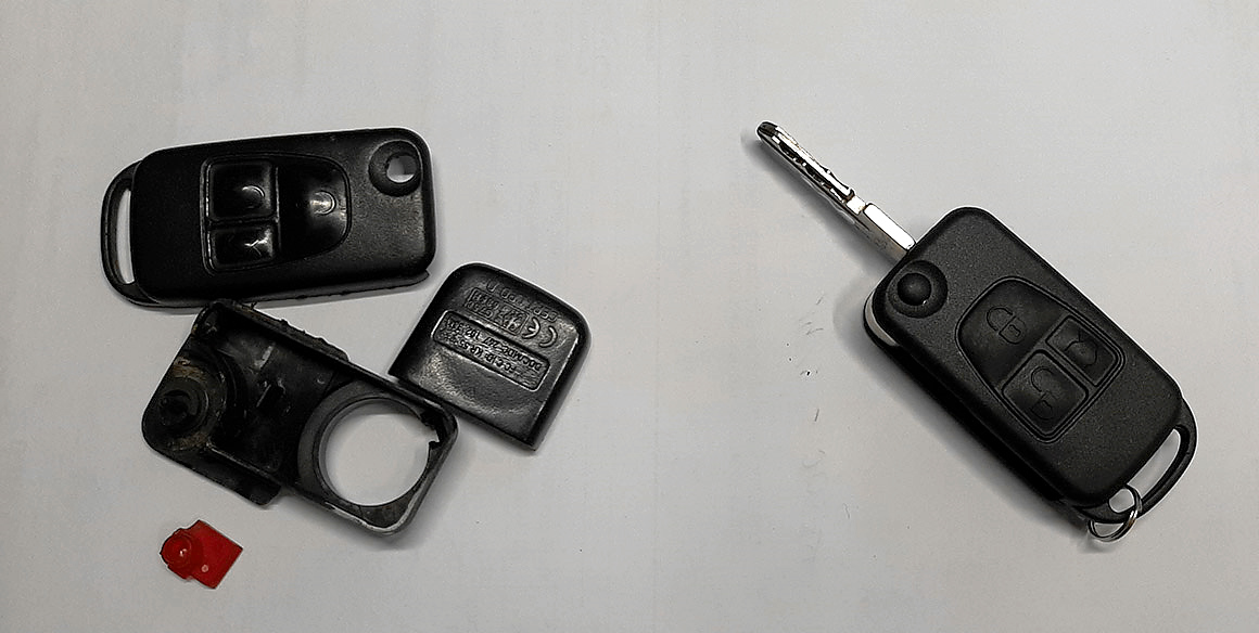 Die beiden Zündschlüssel sind leider nicht mehr in einem guten Zustand, die 20 Jahre sind nicht spurlos an ihnen vorbei gegangen. Im I-Net gab's günstige Nachbauten und so machte ich mich mutig ans Werk erst mal den Ersatzschlüssel umzubauen. Den alten aufzubrechen kostet schon etwas Überwindung, aber es ist keine große Sache. Hier das Ergebnis: