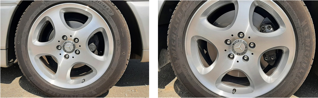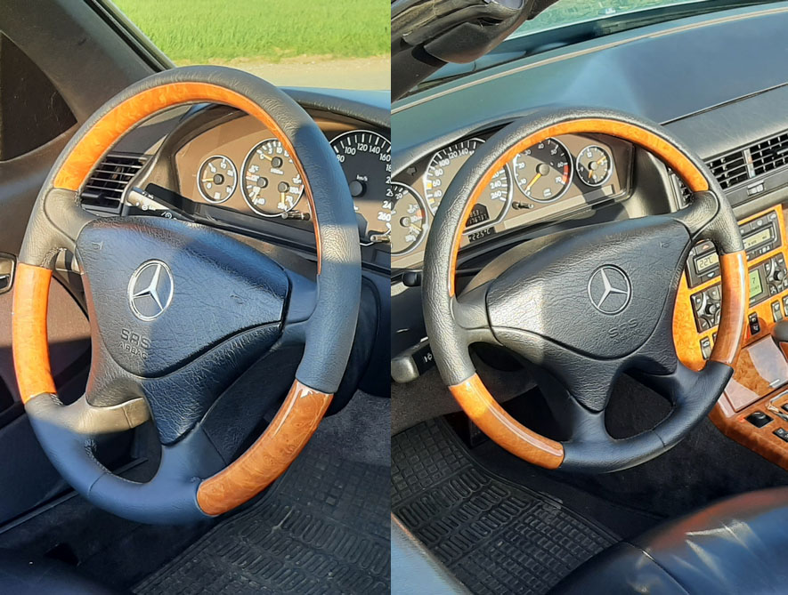 Das neue belederte Lenkrad hat einen leichten Farbunterschiede zum Airbag. Das neue Leder war eher dunkelgrau als schwarz. Da mir das nicht so gut gefiel, habe ich das Leder mit Lederfarbe vom Lederzentrum nachgeschwärzt und anschließend versiegelt. Jetzt passt es gut.